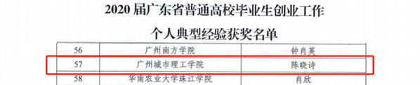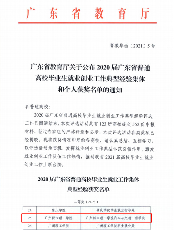 本网讯(记者 梁悦)4月25日,广东省教育厅公布了2020届广东省普通高校毕业生就业创业工作典型经验集体和个人获奖名单,我校汽车与交通工程学院获得就业工作典型经验集体二等奖,创新创业教育学院获得创业工作集体典型经验二等奖,赖卓虹、张全胜老师获评就业工作个人典型,陈晓诗老师获评创业工作个人典型。