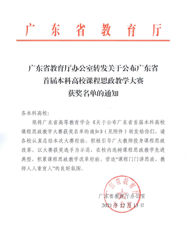 据悉,广东省首届本科高校课程思政教学大赛设文科一组、文科二组、理科组、工科组、农医组、外语组共六个组,全省各本科高校共推荐450名教师参赛,107名参赛教师入围决赛,共评选出一等奖18名、二等奖30名、三等奖42名、优秀奖16名。我校将以此为契机,落实立德树人根本任务,深化课程思政教学改革,引导广大教师充分发挥课程育人功能,提高人才培养质量。