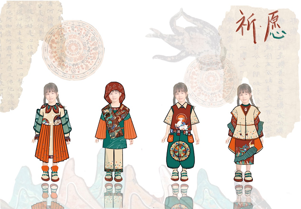 珠宝学院学生包吴冰的作品《祈愿》获得创意设计奖,灵感来源于敦煌的神话故事——《鹿王本生图》以及敦煌的佛像。九色鹿象征着温润善良、勇敢正义的品质,在故事中九色鹿经常帮助遇到困难的人,主题运用在童装中,因为小孩儿是纯洁的、善良的形象。