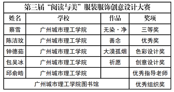 本网讯(记者 郭韵焓)10月10日,我校图书馆获悉,第三届“阅读与美”服装服饰创意设计大赛评选结束,全国各地共有304所高校图书馆报名组织单位参与大赛,5489位选手报名参赛,线上征集与线下报送作品共4256件。我校珠宝学院学生作品获得三等奖1项、优秀奖1项,并获色彩设计奖、创意设计奖,珠宝学院教师邱俞皓获优秀指导老师,我校图书馆获优秀组织奖。