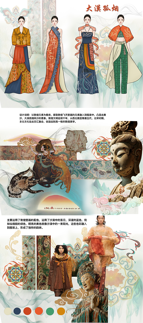 珠宝学院学生钟德茹的作品《大漠孤烟》获得色彩设计奖,作品以敦煌元素为载体,提取敦煌飞天壁画的元素融入到服装中,凸显出黄沙,大漠孤烟风沙的意象。敦煌文明延续千年,从西北魏至隋唐五代,北宋时期,多元文化在此交汇融合,创造出别具一格的敦煌美学。