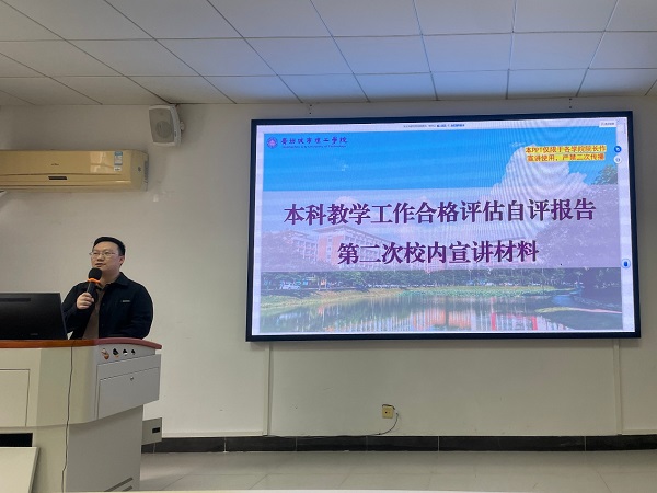 陈磊宣讲合格评估学校自评报告核心内容。他从自评报告基本情况、主要框架、核心要点以及校长补充报告等四个方面进行介绍,详细讲解了学校定位与办学特色、人才培养思路与模式、专业建设与课程改革、质量保障、教育教学成果、创新办学等重点内容。陈磊指出,合格评估已经到了决战阶段,全院教工要全面把握报告核心要义与指标体系内涵,与学院教育教学举措构成逻辑体系。形成人人了解评估、人人关心评估、人人参与评估的良好氛围。